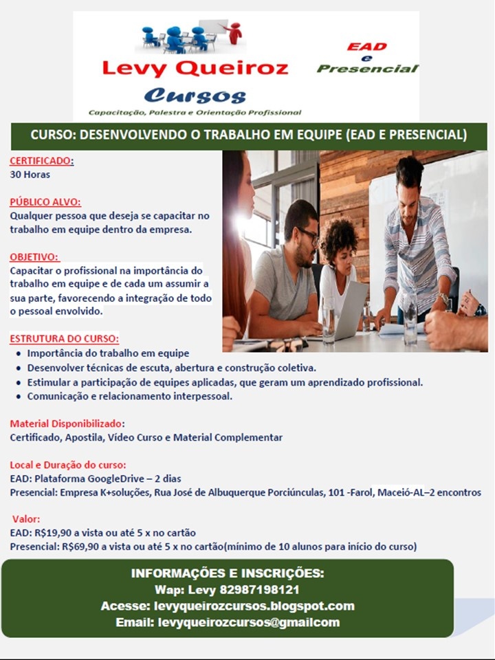 Os cursos da empresa Levy Queiroz Cursos, são ministrados pelo Profª Levy de Queiroz Carmo, que tem a formação em Estudos Avançados no Programa de Doutoramento em Educação, Mestrado em Recursos Humanos e Gestão do Conhecimento, Especialização em Administração Hospitalar e Graduação em Administração de Empresas. Atuou como Coordenador Administrativo e em diversas atividades administrativa por mais de 20 anos. Atualmente é Professor Universitário, Instrutor de Cursos, Palestrante e Consultor.