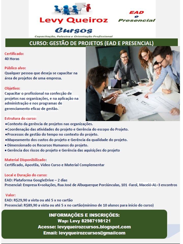 Os cursos da empresa Levy Queiroz Cursos, são ministrados pelo Profª Levy de Queiroz Carmo, que tem a formação em Estudos Avançados no Programa de Doutoramento em Educação, Mestrado em Recursos Humanos e Gestão do Conhecimento, Especialização em Administração Hospitalar e Graduação em Administração de Empresas. Atuou como Coordenador Administrativo e em diversas atividades administrativa por mais de 20 anos. Atualmente é Professor Universitário, Instrutor de Cursos, Palestrante e Consultor.