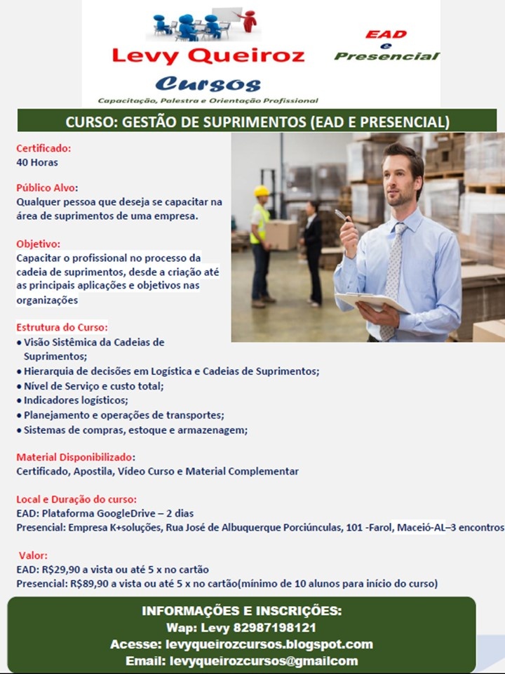 Os cursos da empresa Levy Queiroz Cursos, são ministrados pelo Profª Levy de Queiroz Carmo, que tem a formação em Estudos Avançados no Programa de Doutoramento em Educação, Mestrado em Recursos Humanos e Gestão do Conhecimento, Especialização em Administração Hospitalar e Graduação em Administração de Empresas. Atuou como Coordenador Administrativo e em diversas atividades administrativa por mais de 20 anos. Atualmente é Professor Universitário, Instrutor de Cursos, Palestrante e Consultor.