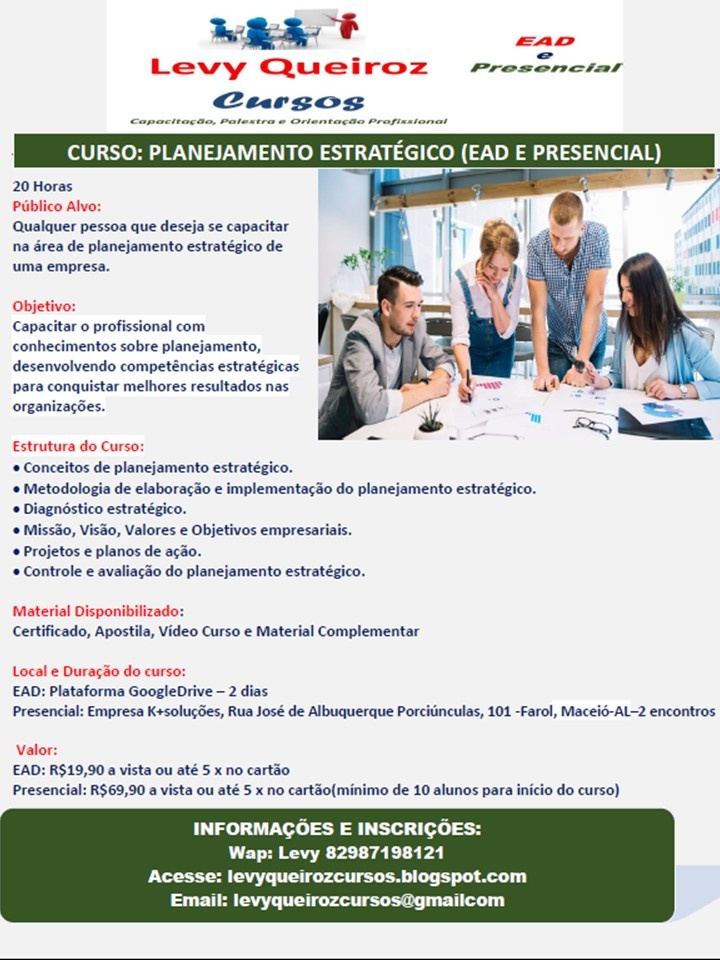 Os cursos da empresa Levy Queiroz Cursos, são ministrados pelo Profª Levy de Queiroz Carmo, que tem a formação em Estudos Avançados no Programa de Doutoramento em Educação, Mestrado em Recursos Humanos e Gestão do Conhecimento, Especialização em Administração Hospitalar e Graduação em Administração de Empresas. Atuou como Coordenador Administrativo e em diversas atividades administrativa por mais de 20 anos. Atualmente é Professor Universitário, Instrutor de Cursos, Palestrante e Consultor.