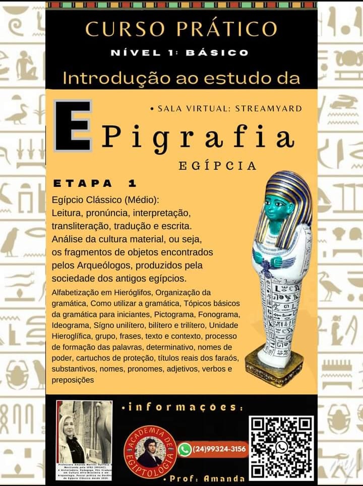 - Curso de Introdução ao Egípcio Clássico: Universidade de São Paulo, GT de História Antiga; com o Prof. Dr. Ronaldo Gurgel Pereira: Online;- Língua Egípcia e Escritura Hieroglífica: Nível Inicial. Academia de Egiptologia, com Laura Egiptologia: Online.