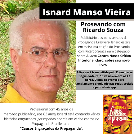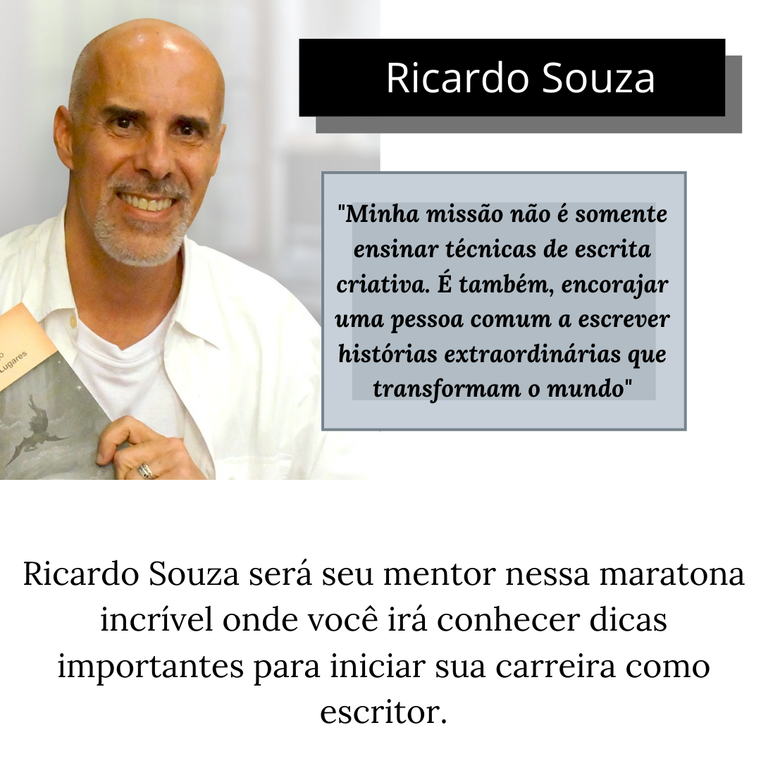 Ricardo Souza é Escritor, Mentor de Escritores, Publicitário, Editor do Selo Neblina Negra e da Lenari Editores. Dirigiu Agências de Publicidade no Rio e em São Paulo, como Diretor de Criação e Operacional. Professor convidado em cursos de graduação e pós graduação. Foi colunista em vários jornais e Country Manager em empresa internacional de mídia impressa. Tem livros publicados e participa de várias antologias. Tem mais de 1.000 alunos formados em seus cursos e Workshops de Escrita Criativa.