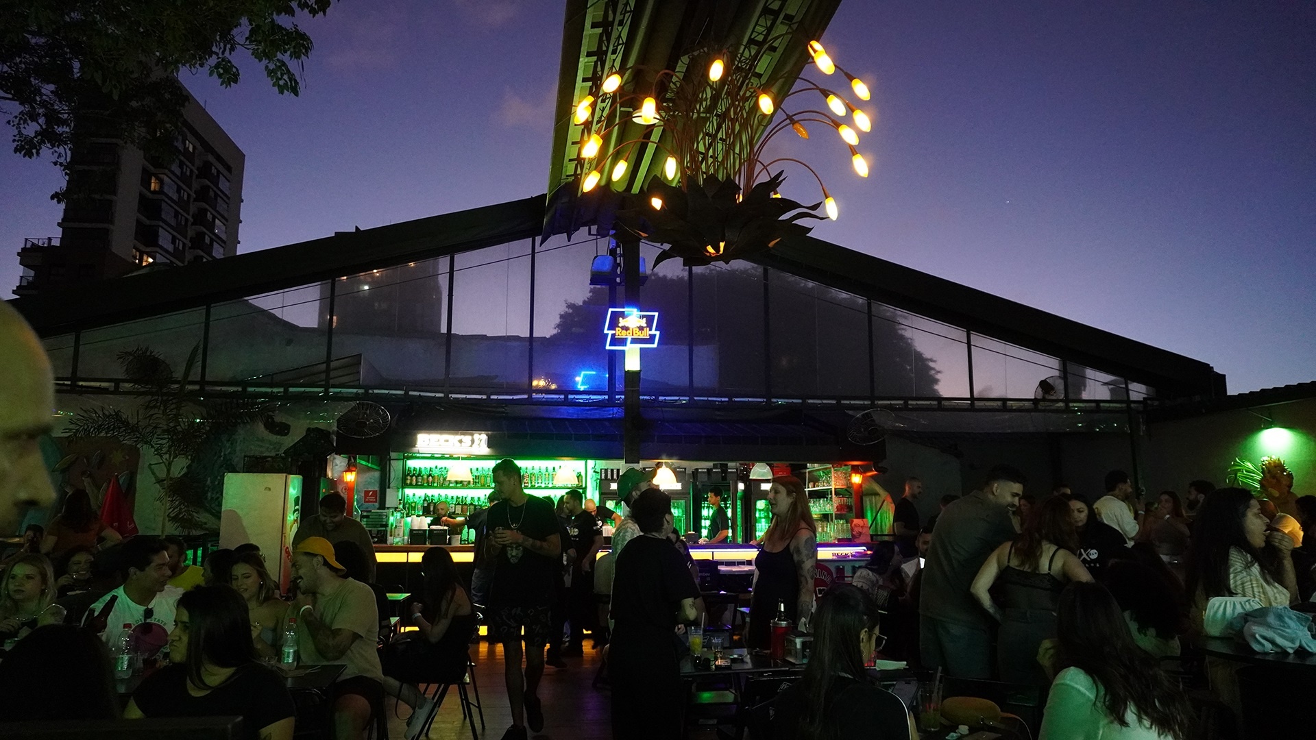 Bar descontraído com paredes decoradas, petiscos tradicionais e várias mesas ao ar livre.