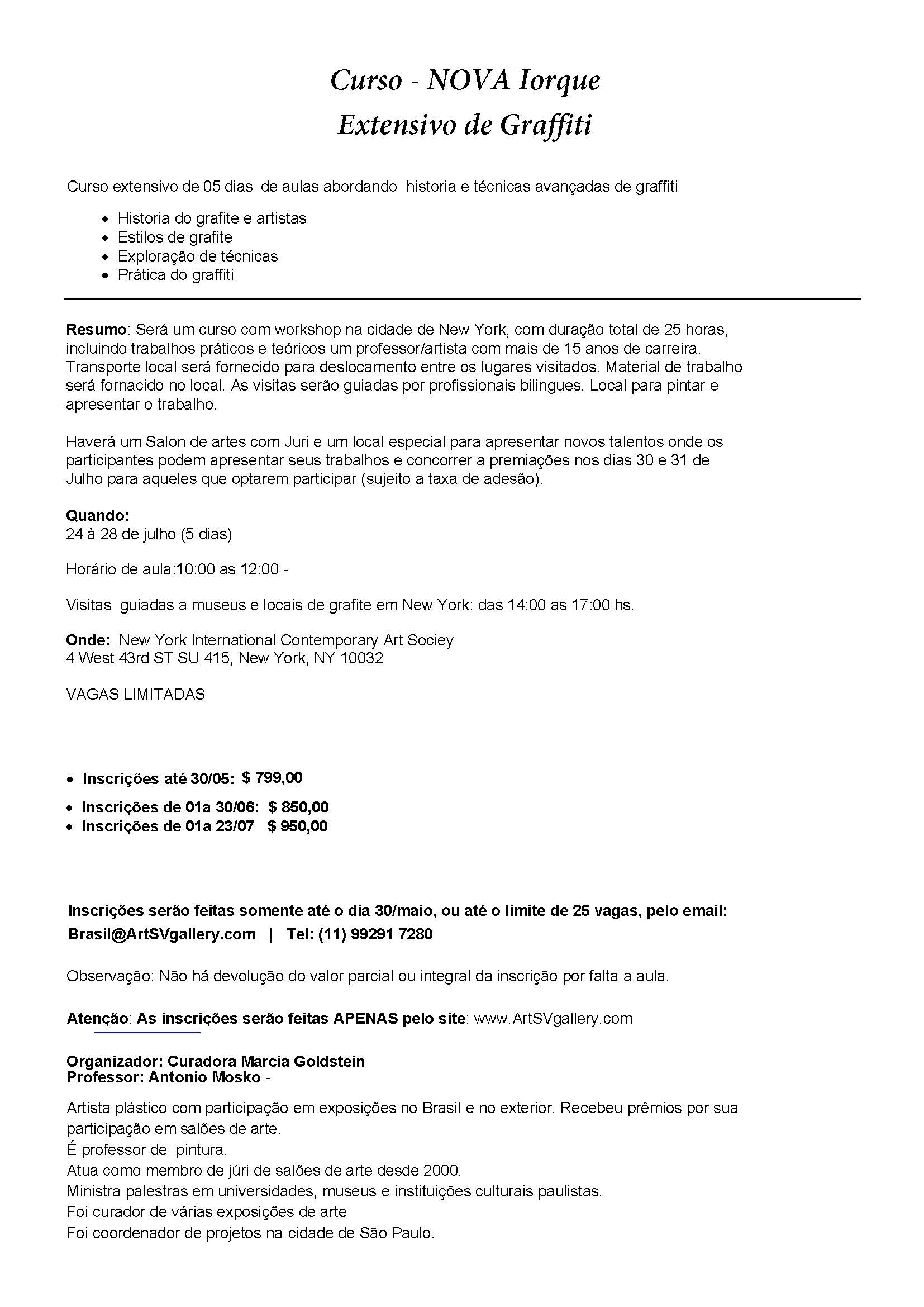 Resumo: Será um curso com workshop na cidade de New York, com duração total de 25 horas, incluindo trabalhos práticos e teóricos um professor/artista com mais de 15 anos de carreira.