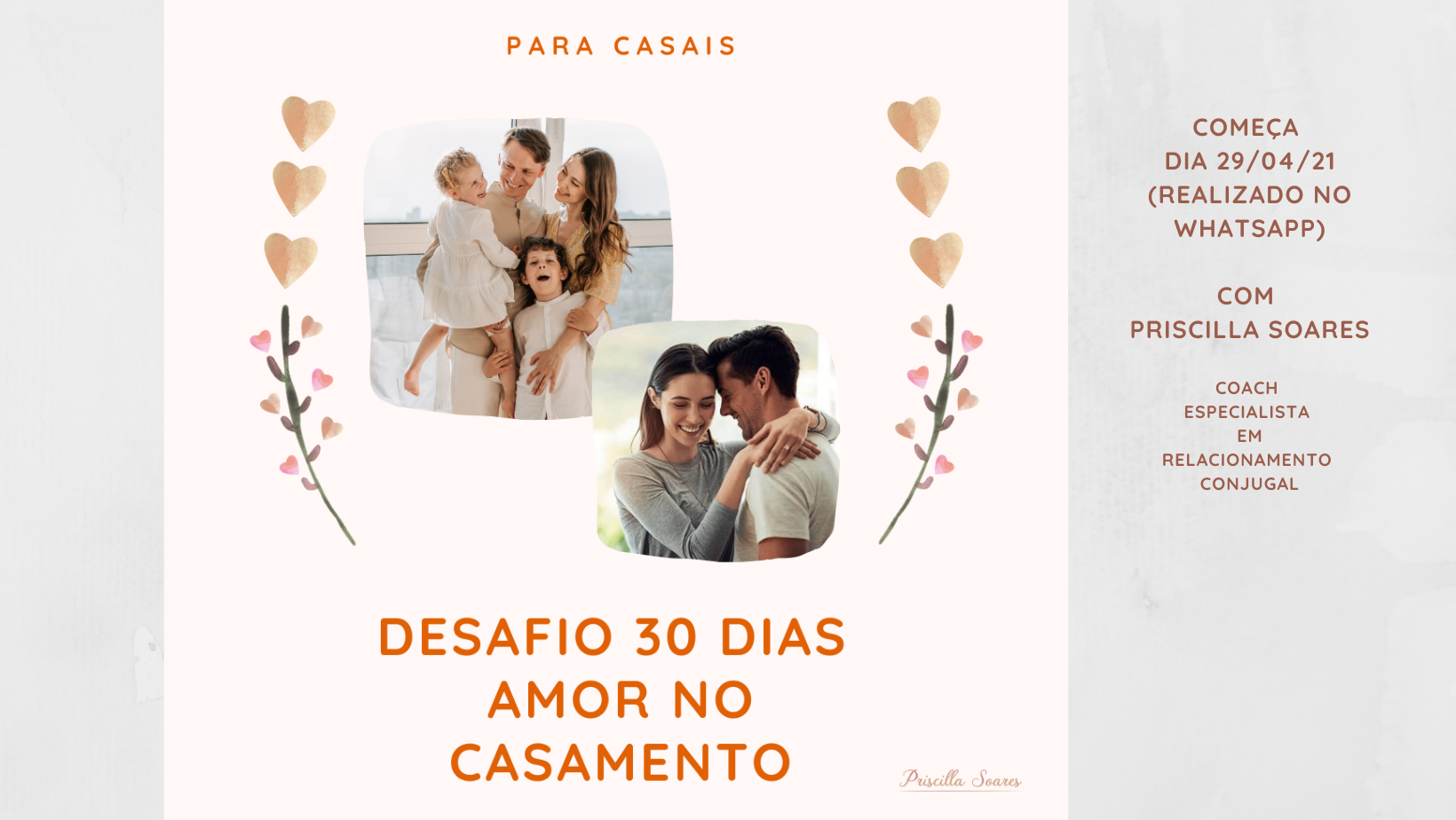 Este Desafio foi criado para auxiliar vocês casais a fortalecer o Relacionamento no Casamento. E será realizado totalmente no WhatsApp durante 30 Dias. Você receberá ferramentas e técnicas para fortalecer e cultivar o Amor no seu Casamento!!!