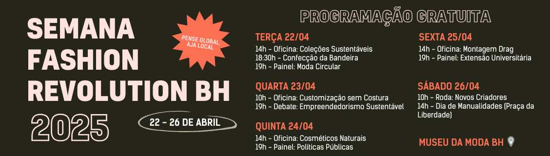 Em sua 11ª edição consecutiva em Belo Horizonte, a semana convida o público a ocupar o Museu da Moda com oficinas, rodas de conversa, paineis, performances e encontros entre criadores, estudantes, ativistas e especialistas.