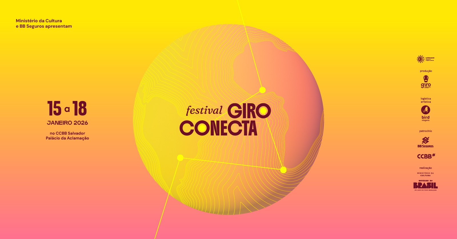 O Festival Giro Conecta é uma produção da Giro Planejamento Cultural, com patrocínio da BB Seguros. Uma realização CCBB Salvador, por meio do Ministério da Cultura - Governo Federal.