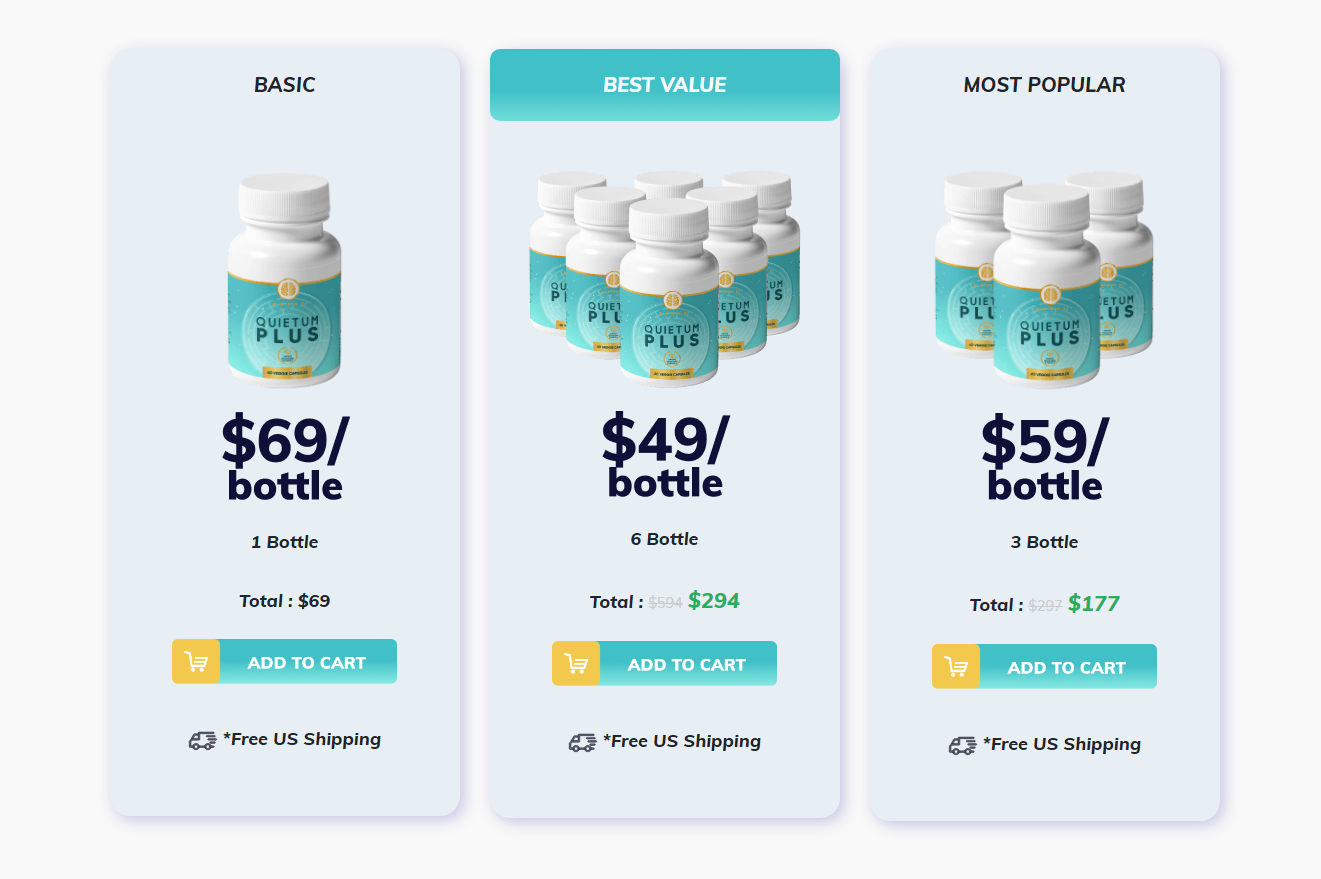 • Most Popular Package: Buy a three-bottle supply of Quietum Plus at $69 for each bottle, and free shipping is available.